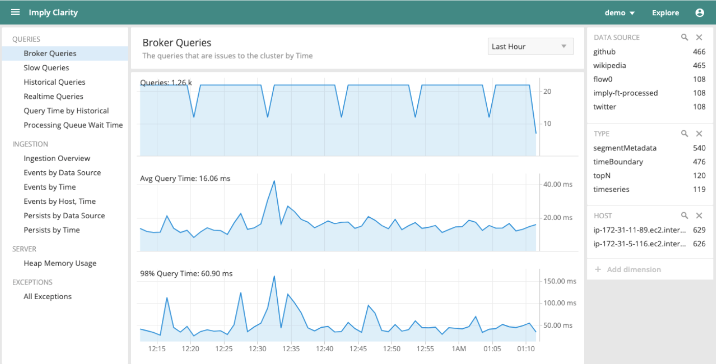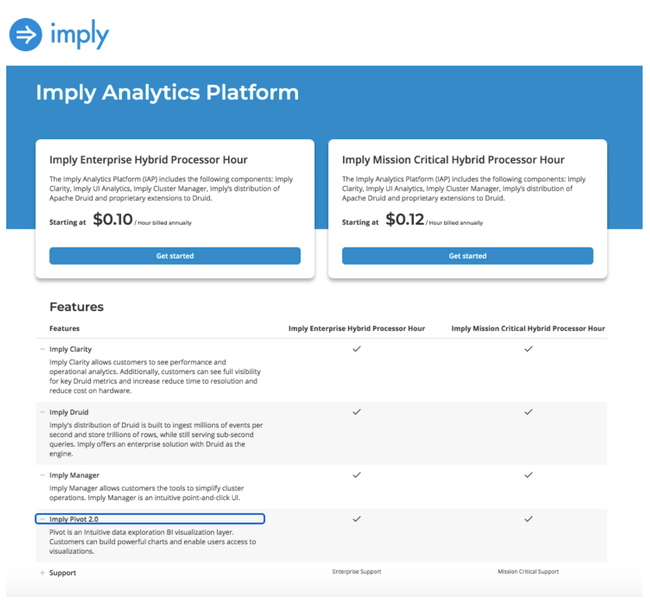 Proven: in production at scale across industries as diverse as telecoms (NTT, BT, Charter), financial services (DBS, NYSE) and internet (Twitter, Twitch, TrueCar).Performant: delivers sub-second response even with hundreds of simultaneous users performing ad hoc (unplanned) queries against TB-to-PB sized data sets.Platform: most customers start with a single use case but then come to rely on Imply Cloud as core infrastructure for latency-sensitive projects spanning multiple business functions and BUs.